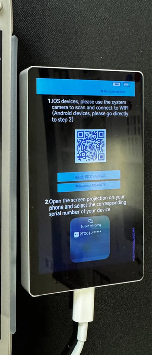 Connect via wired mode for iPhone or use the app for Android. Wireless mode works with both. The monitor auto-rotates for horizontal or vertical framing.